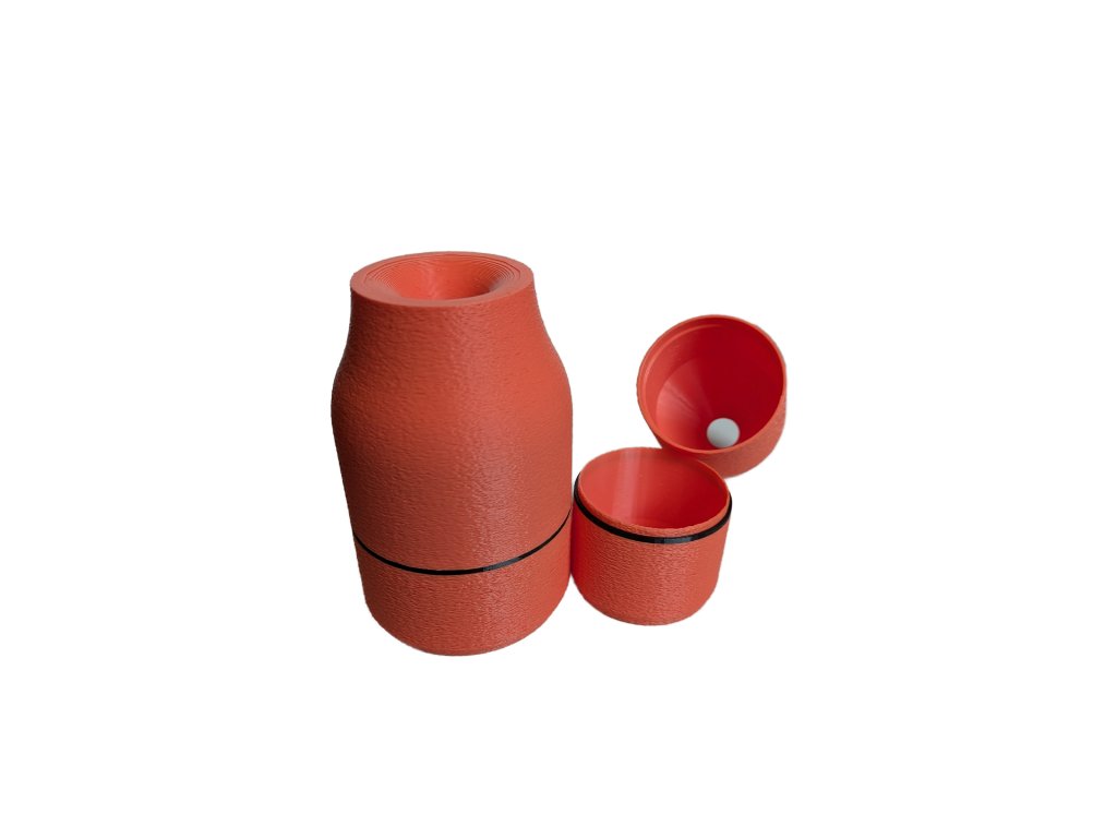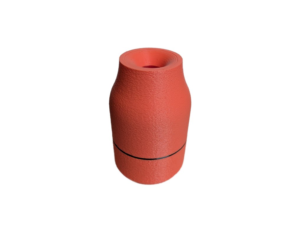 Tento popelník z naší produkce má jedinečný design díky texturovanému povrchu, velmi snadné otevírání a velký zásobník na nedopalky. Je omyvatelný, lehký a velmi příjemný do ruky. Popelník lze vyrobit ze všech možných barev z naší nabídky filamentů, lze různě kombinovat i se středovým kroužkem. V v této variantě nabízíme barvu oranžovou s černým kroužkem. Je velmi lehký a zároveň odolný. Vyrábíme jej ve třech velikostech. Produkt je vyroben na 3D tiskárně z biologicky nezávadného materiálu. Není určen pro klasické cigaretové nedopalky.